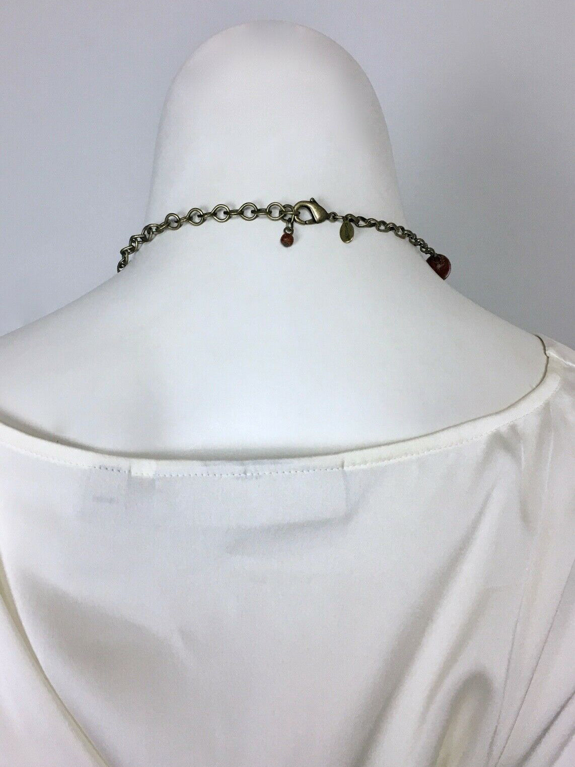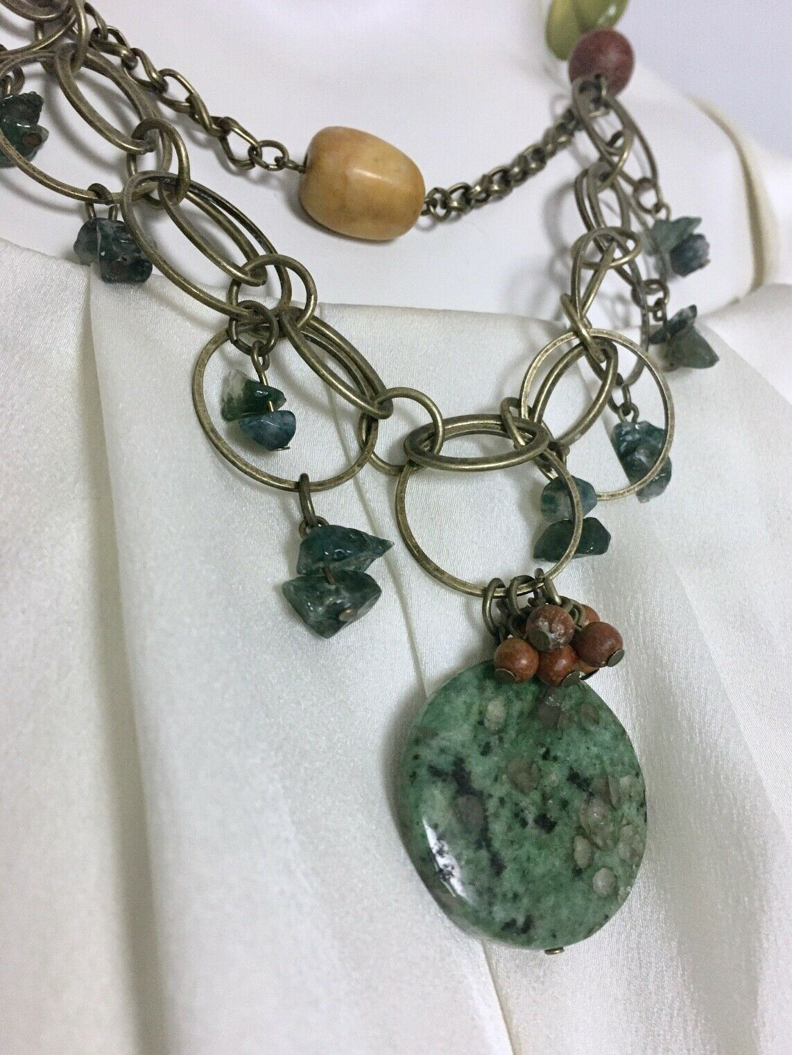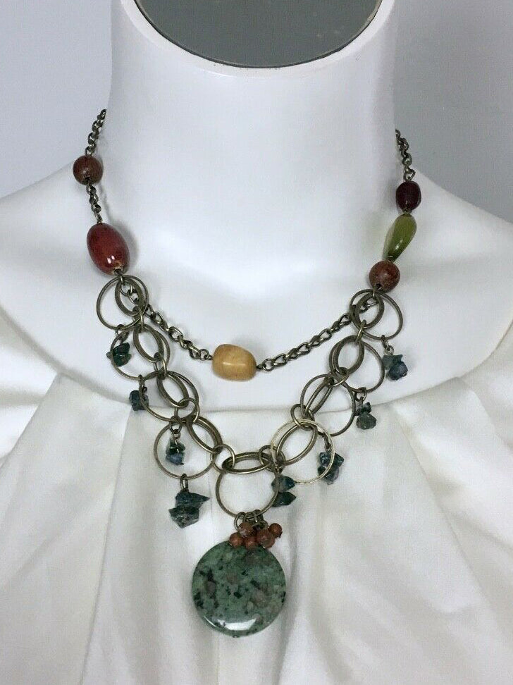 Antique-style multi-strand bronze chain-link necklace with fall color beads, semi-precious stones, & round dark green turquoise pendant. Signed charm next to lobster claw closure. Made by Chico's.