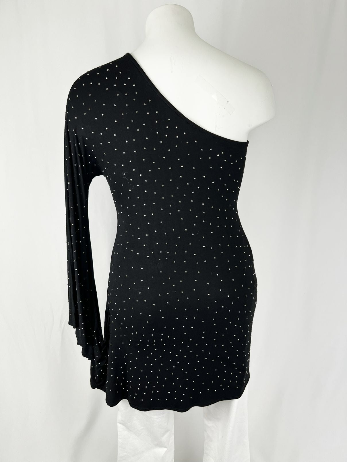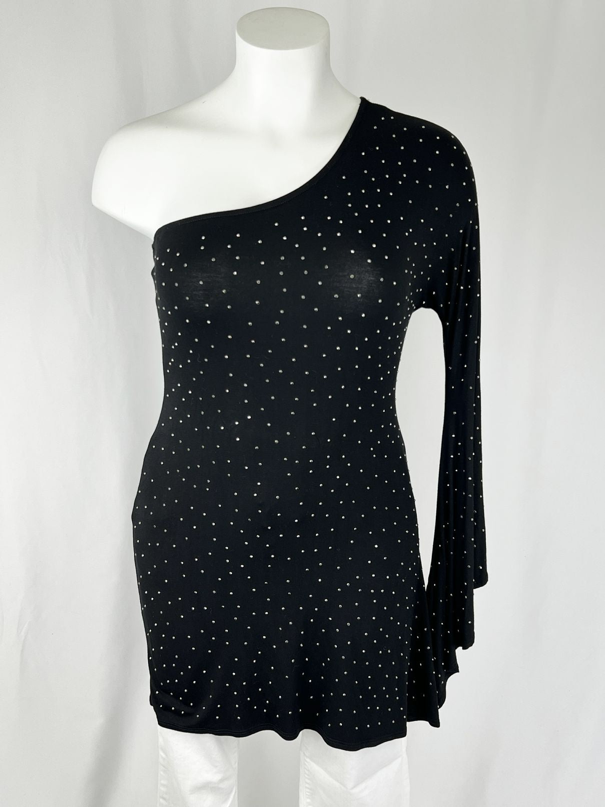 This one-shoulder mini dress or long shirt. Large circle cutout poncho-like style on left side, open-shoulder on right side. Silver studded throughout.