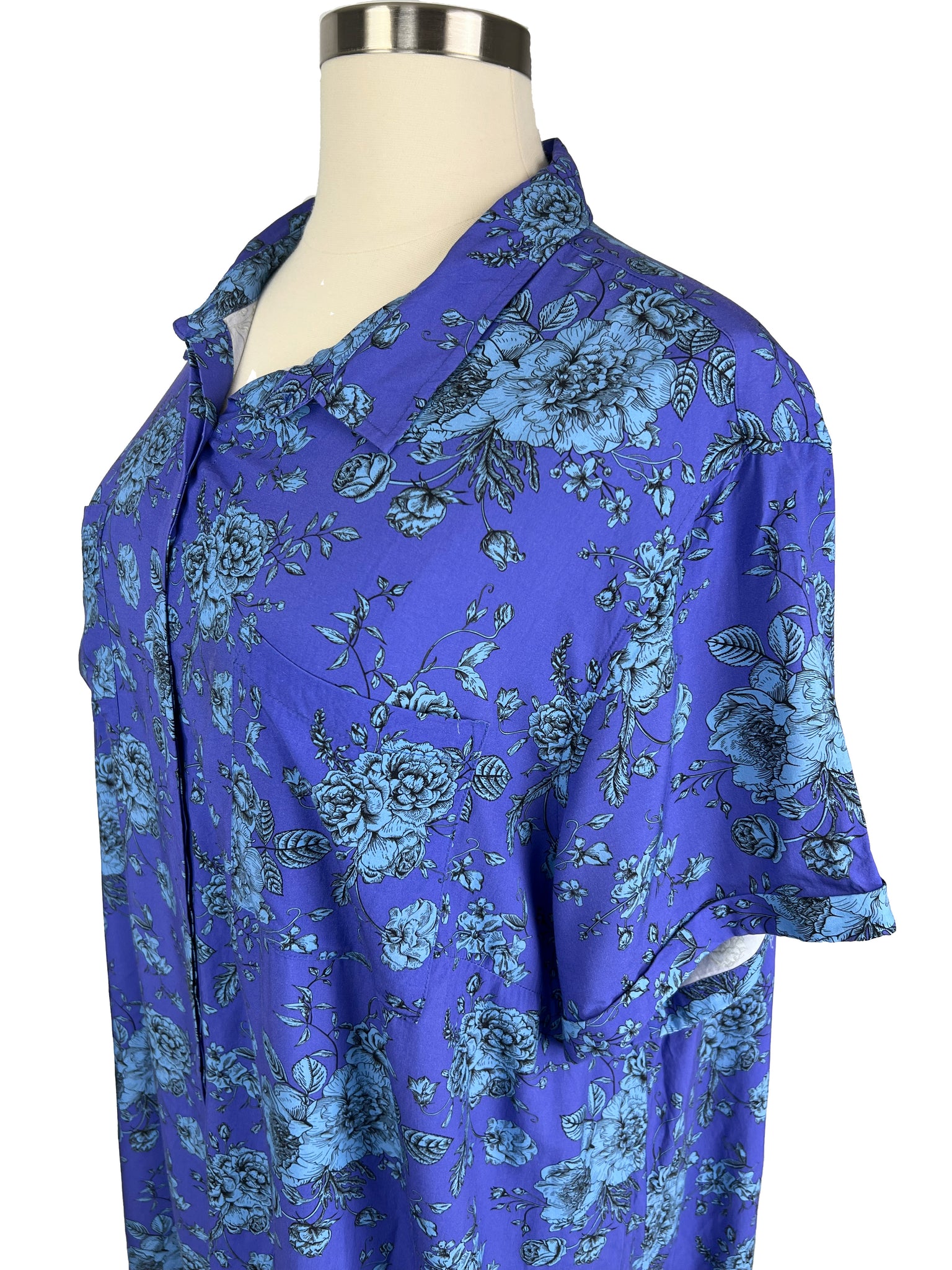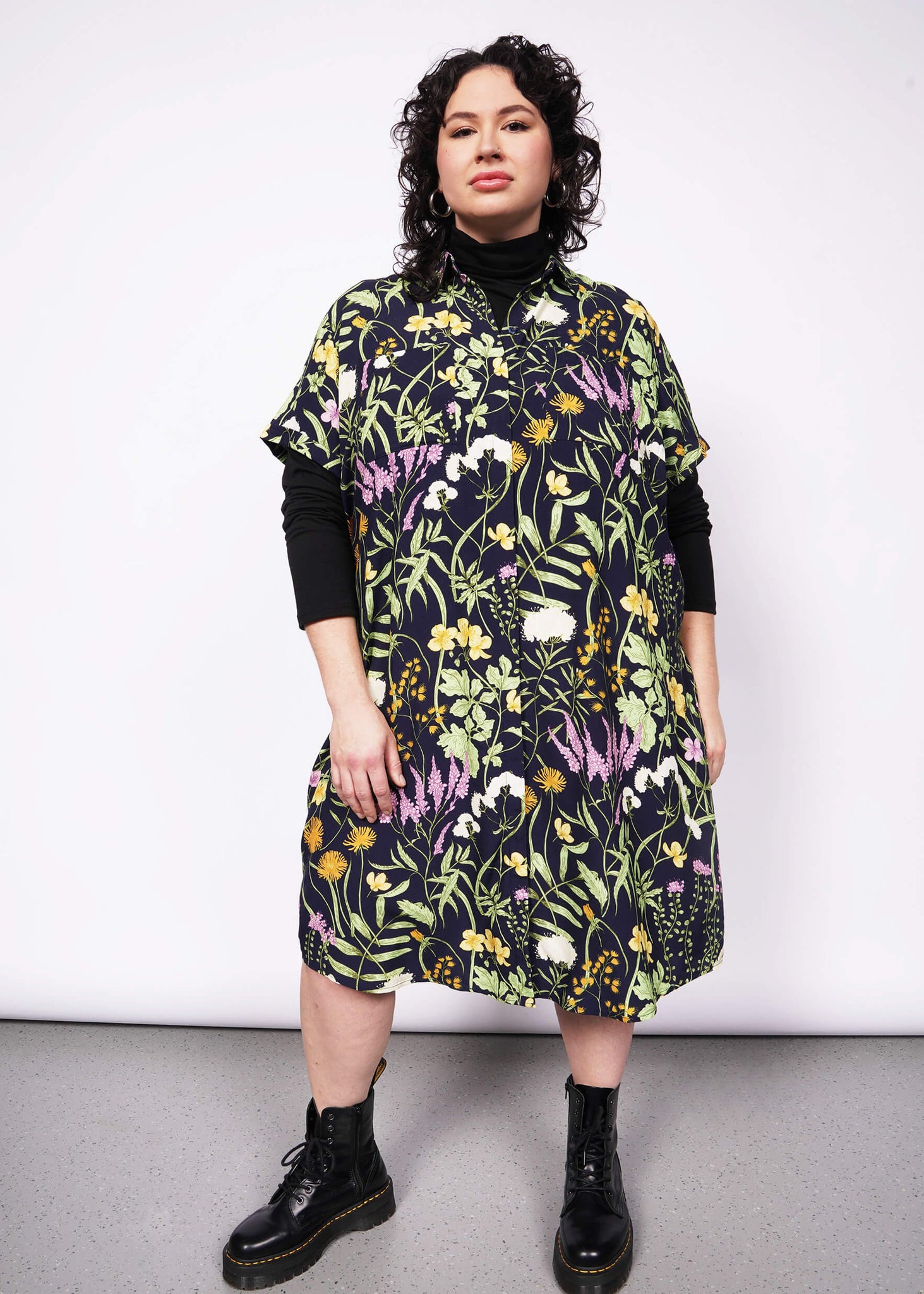 "The Empower Shirt Dress" collared, button-front, midi-length. Purple with blue floral print. Short sleeves with folded sleeve cuff.