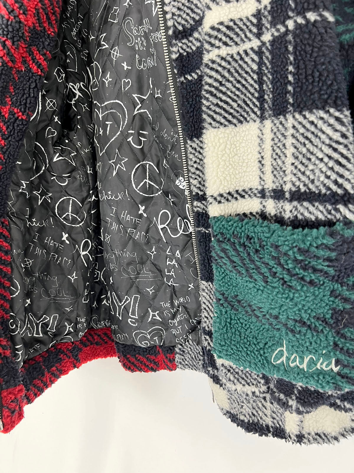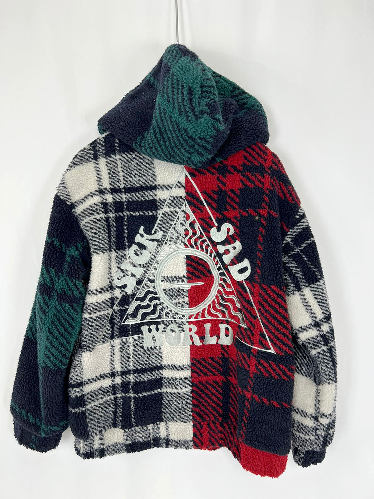 cuz write where it hurts. This jacket has a faux construction, a quilted satin lining, a mixed plaid pattern, a hoodie, long sleeves with elasticated cuffs, square pockets, a Sick Sad World graphic logo triangle embroidered on the back, and a front zipper closure.