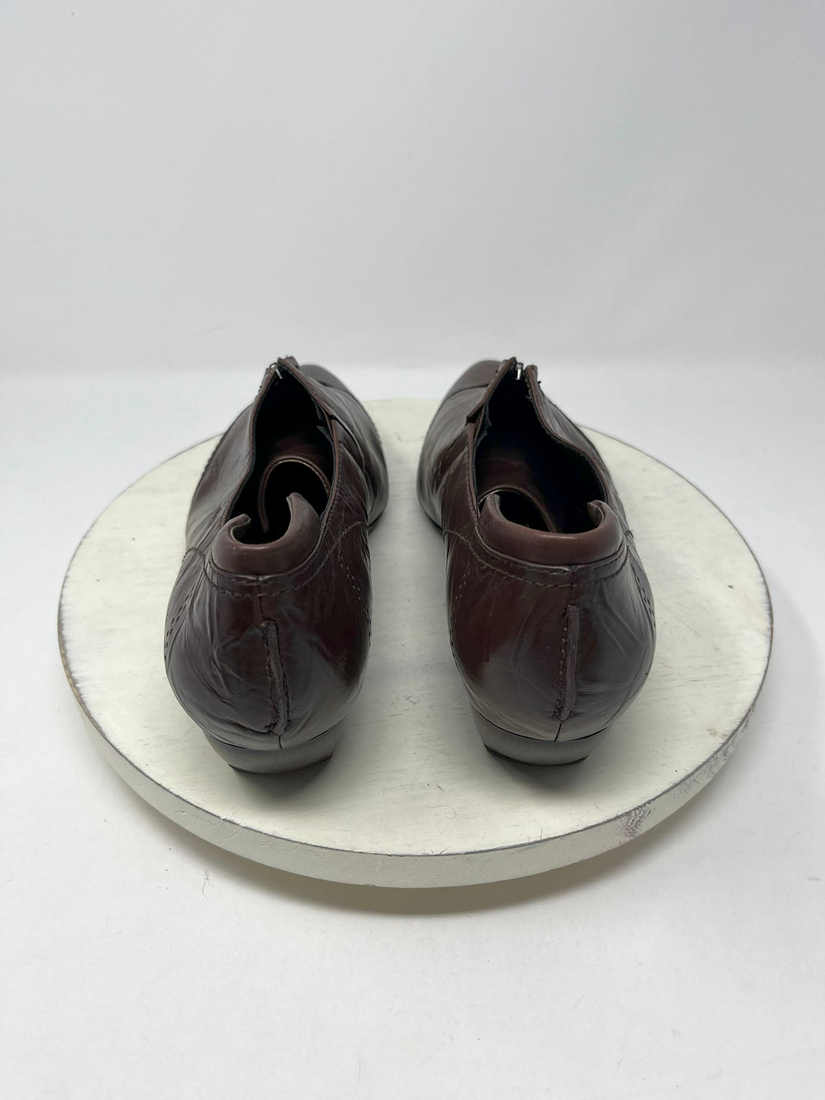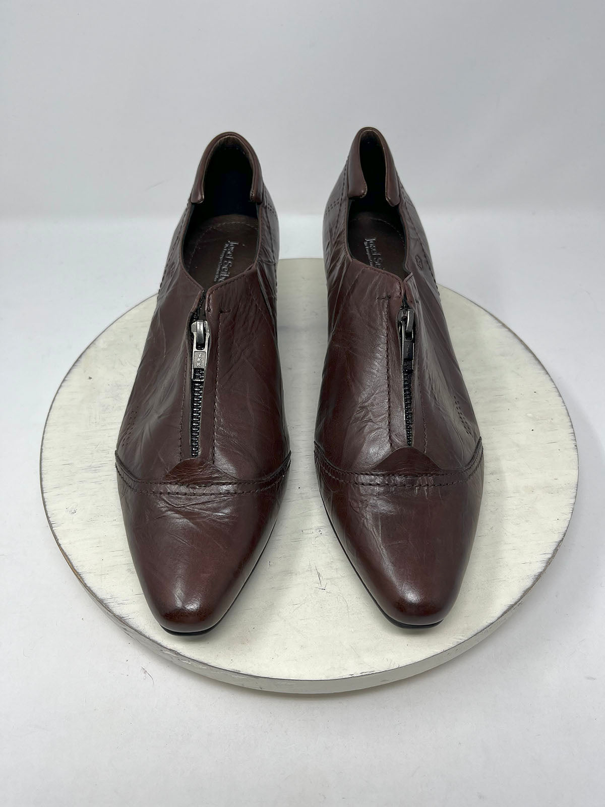Brown wrinkle/crinkle distressed style leather shoe/shootie. Zip-top, pointed toe, faux wood block heel & rubber sole.