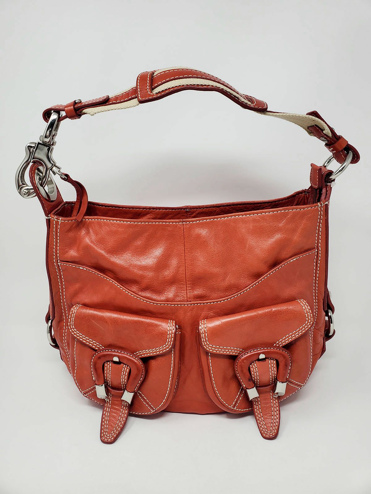 Made in Italy Francesco Biasia shoulder purse with two front buckled pockets. Chunky chunky silver hardware with short beige twill & leather shoulder strap. Zip-top closure.