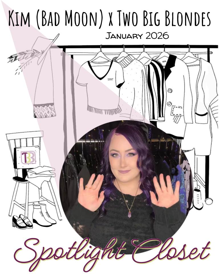 Kim Epsky's Spotlight Closet - January 2026 - featured personal closet items from Kim, the owner of Bad Moon, a mid and plus size vintage shop specializing in witchy, whimsigothic, and nostalgic finds in sizes L-4x+. See full closet collection here: https://twobigblondes.myshopify.com/collections/kim-espkys-spotlight-closet
