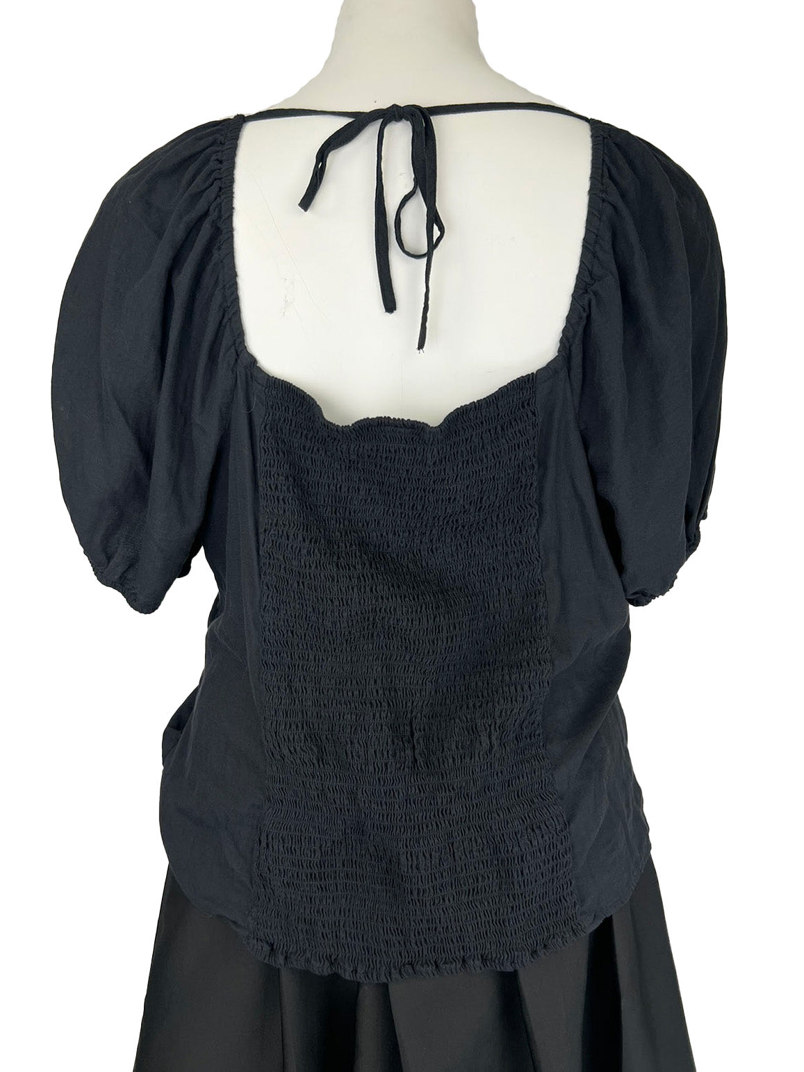 Short, puff-sleeves w/ ruched bodice & smocked back for extra stretch. Tie in back at neckline.