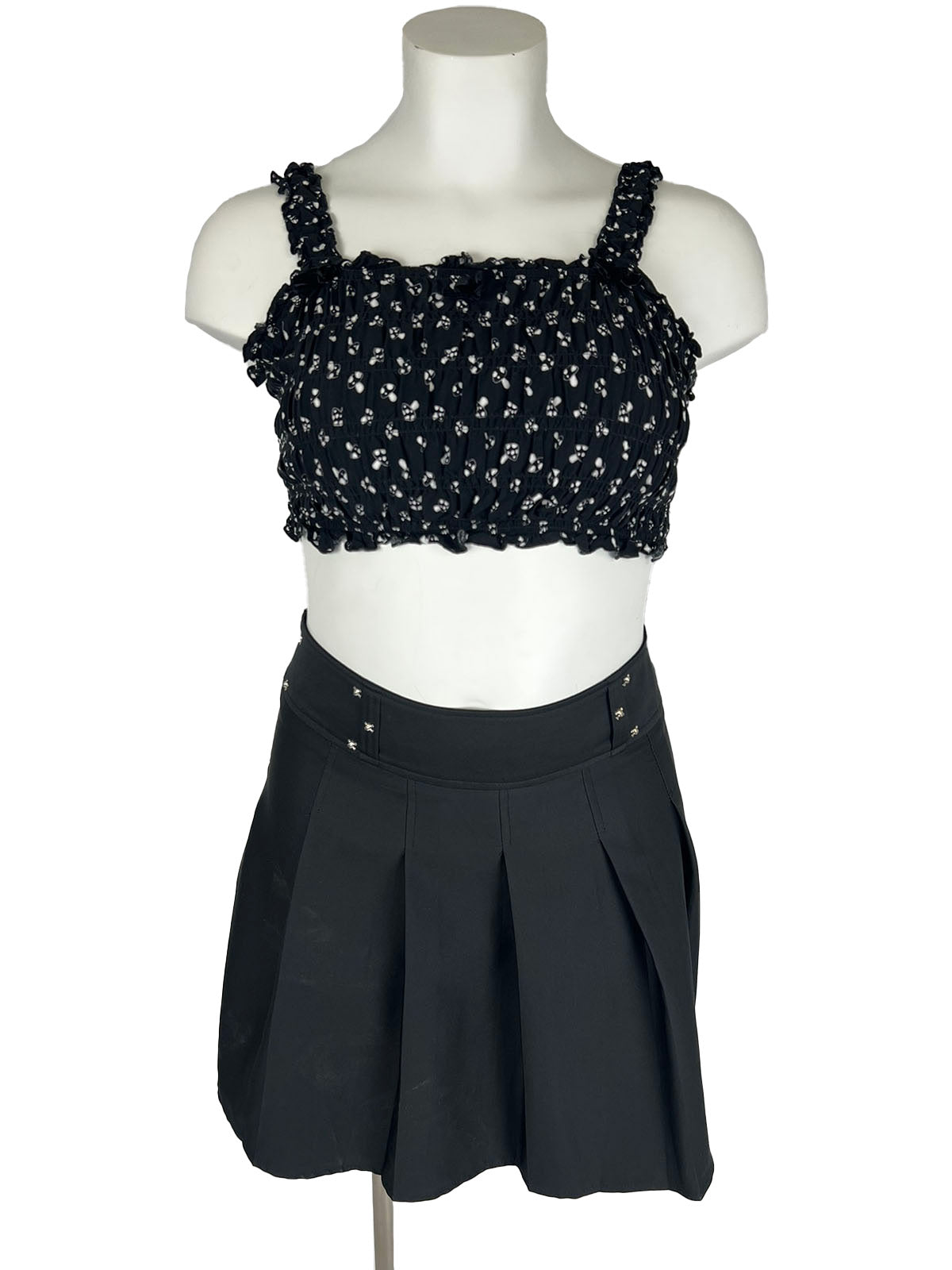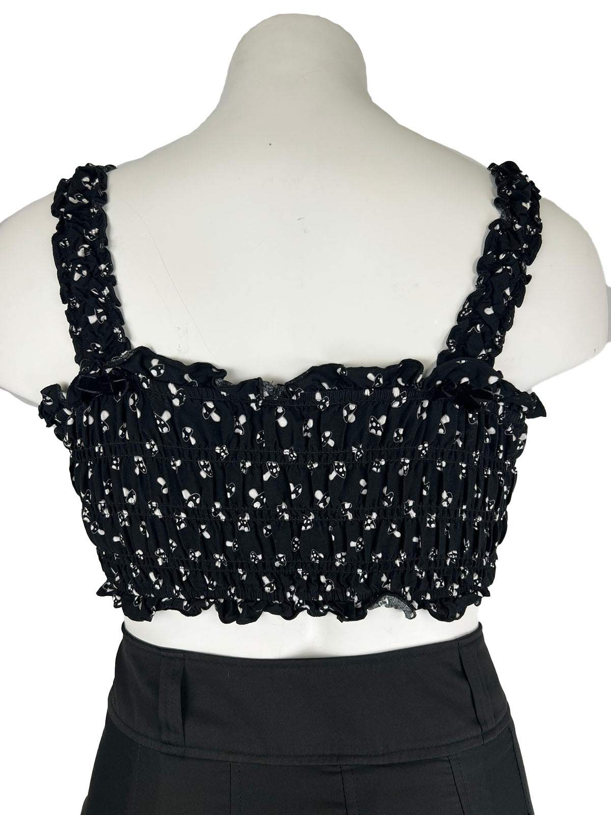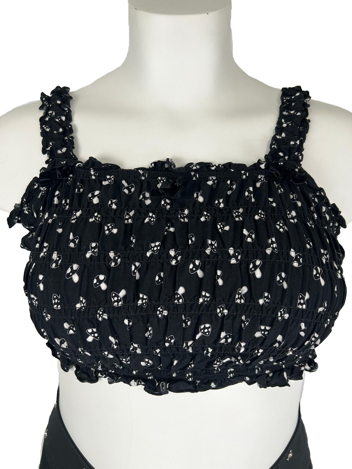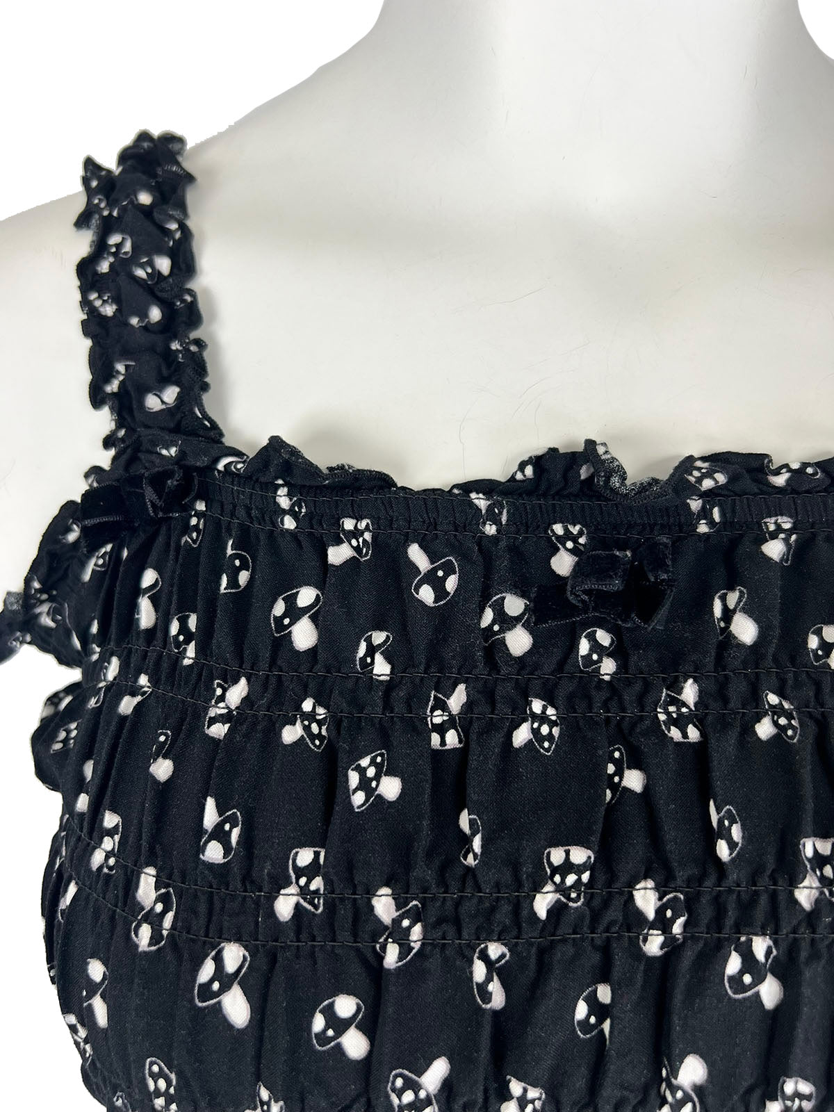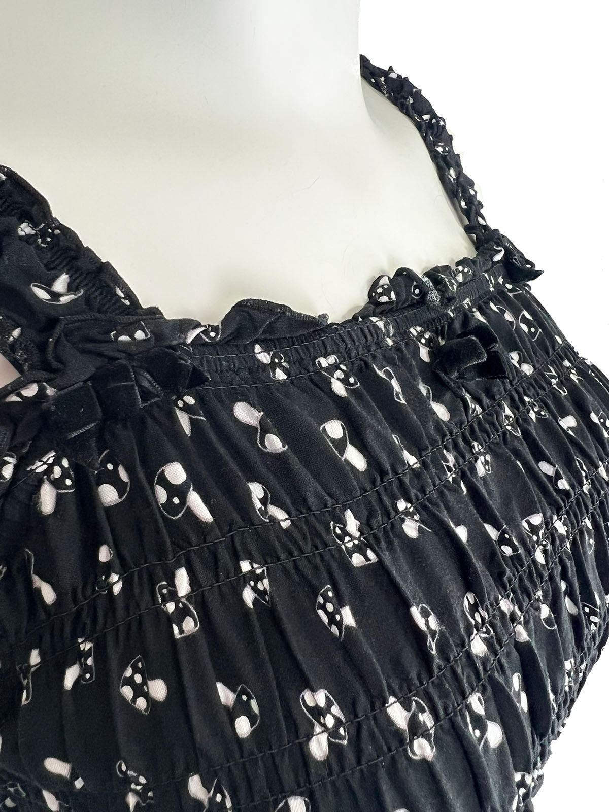 Smocked crop-top with mini black velvet bows and black & white mushroom print.