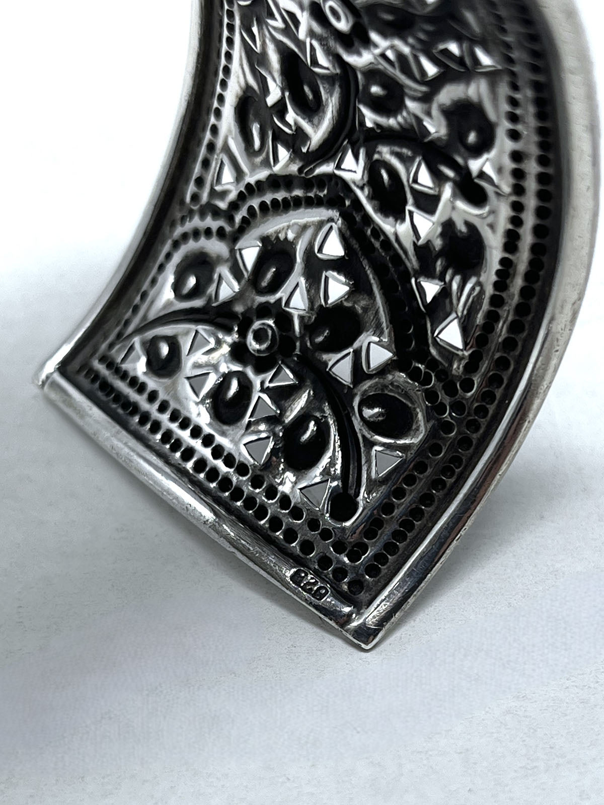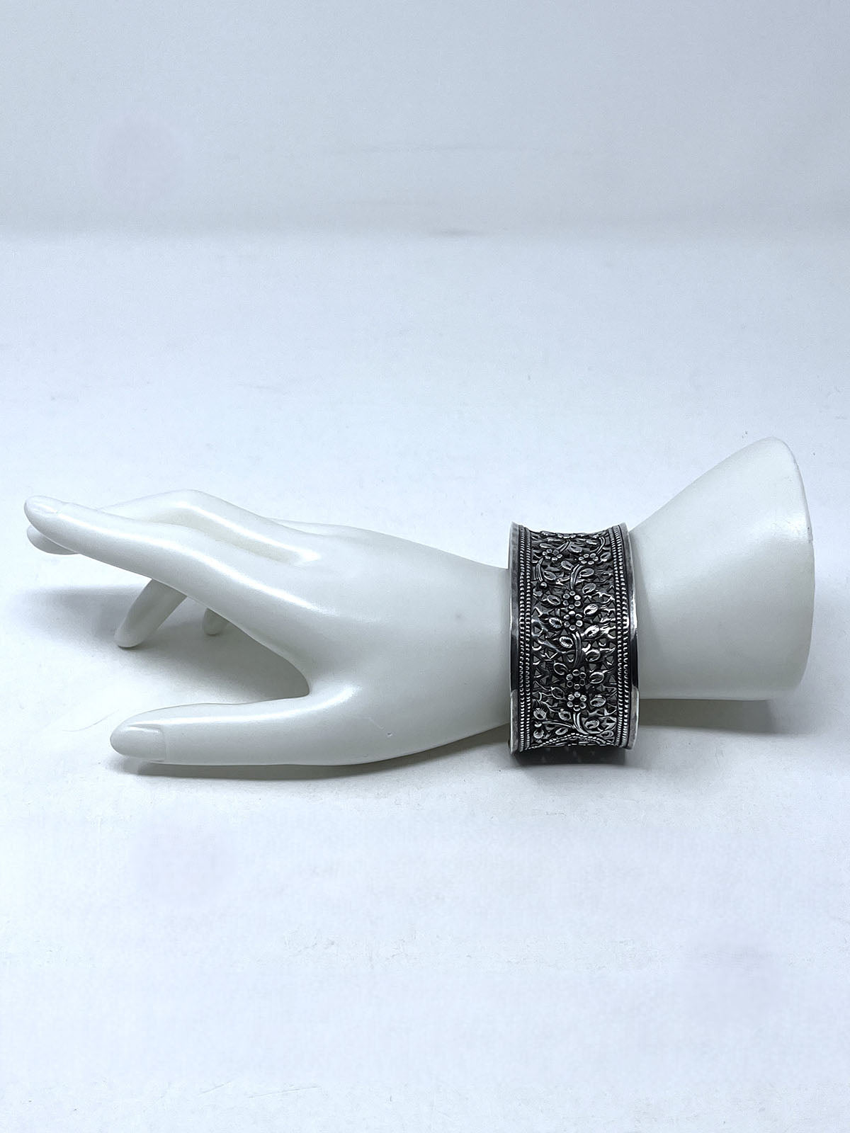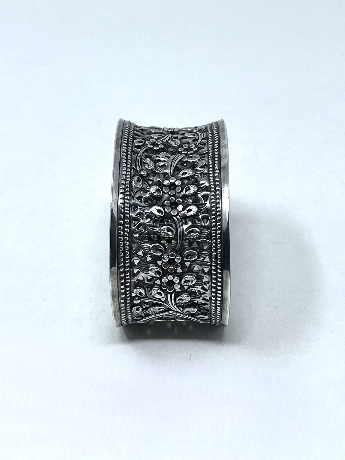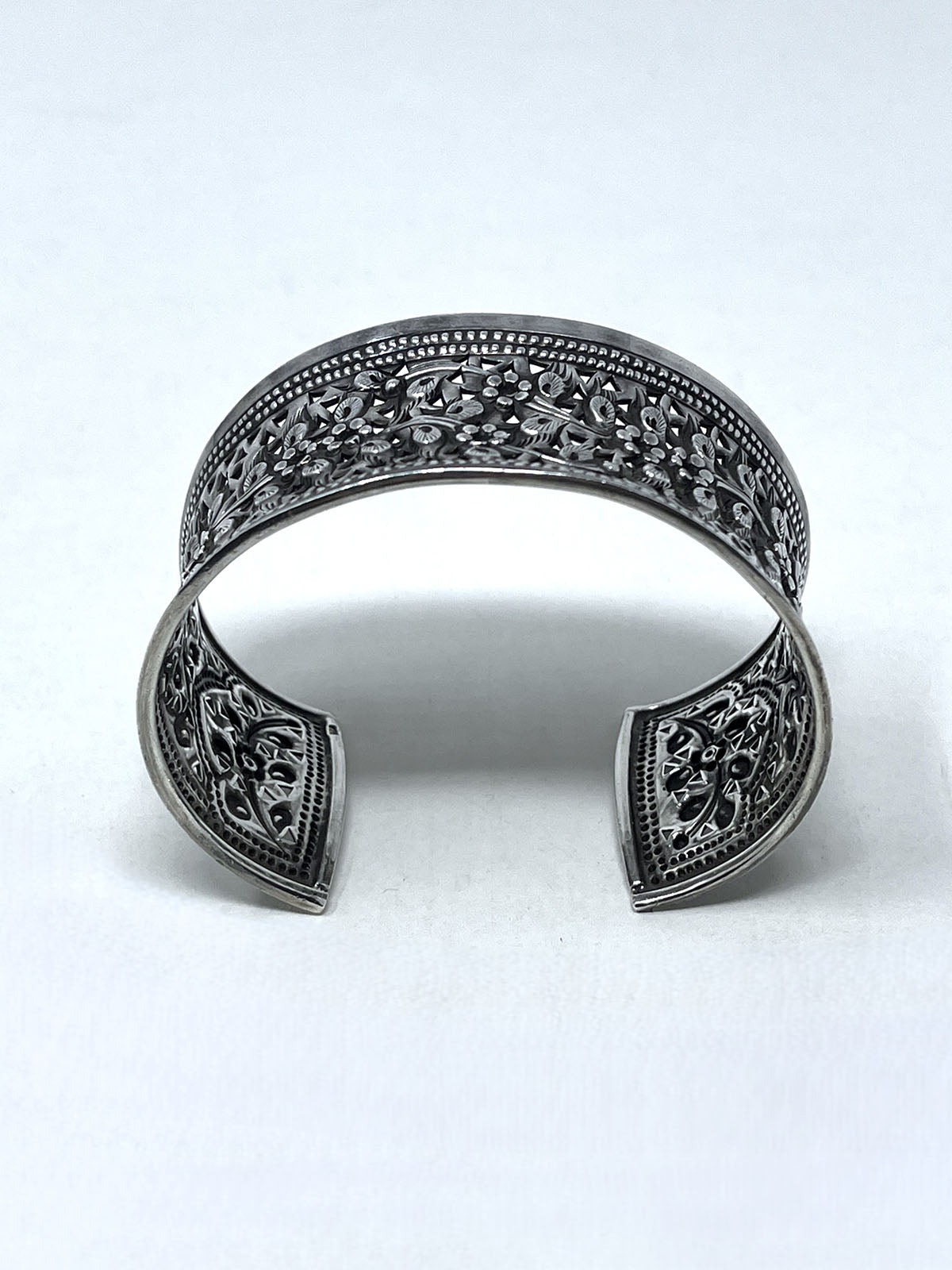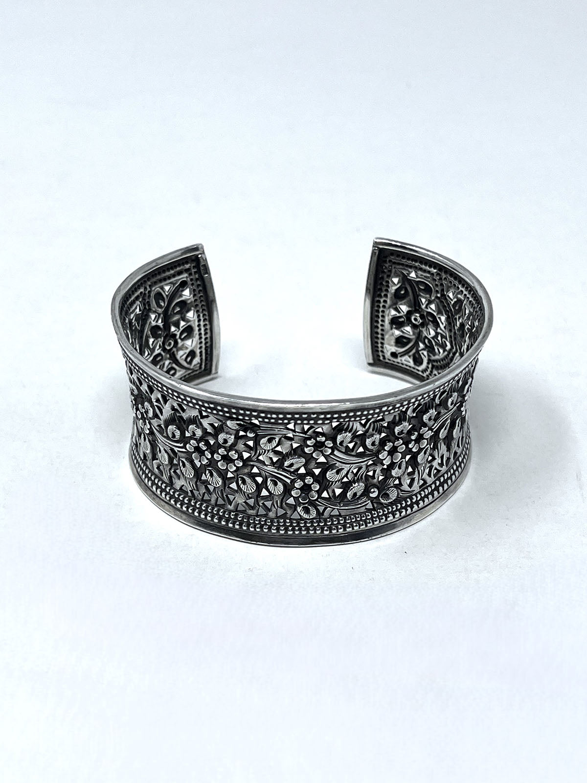Sterling Silver (Stamped 925) wide cuff w/ carved floral Filigree design.