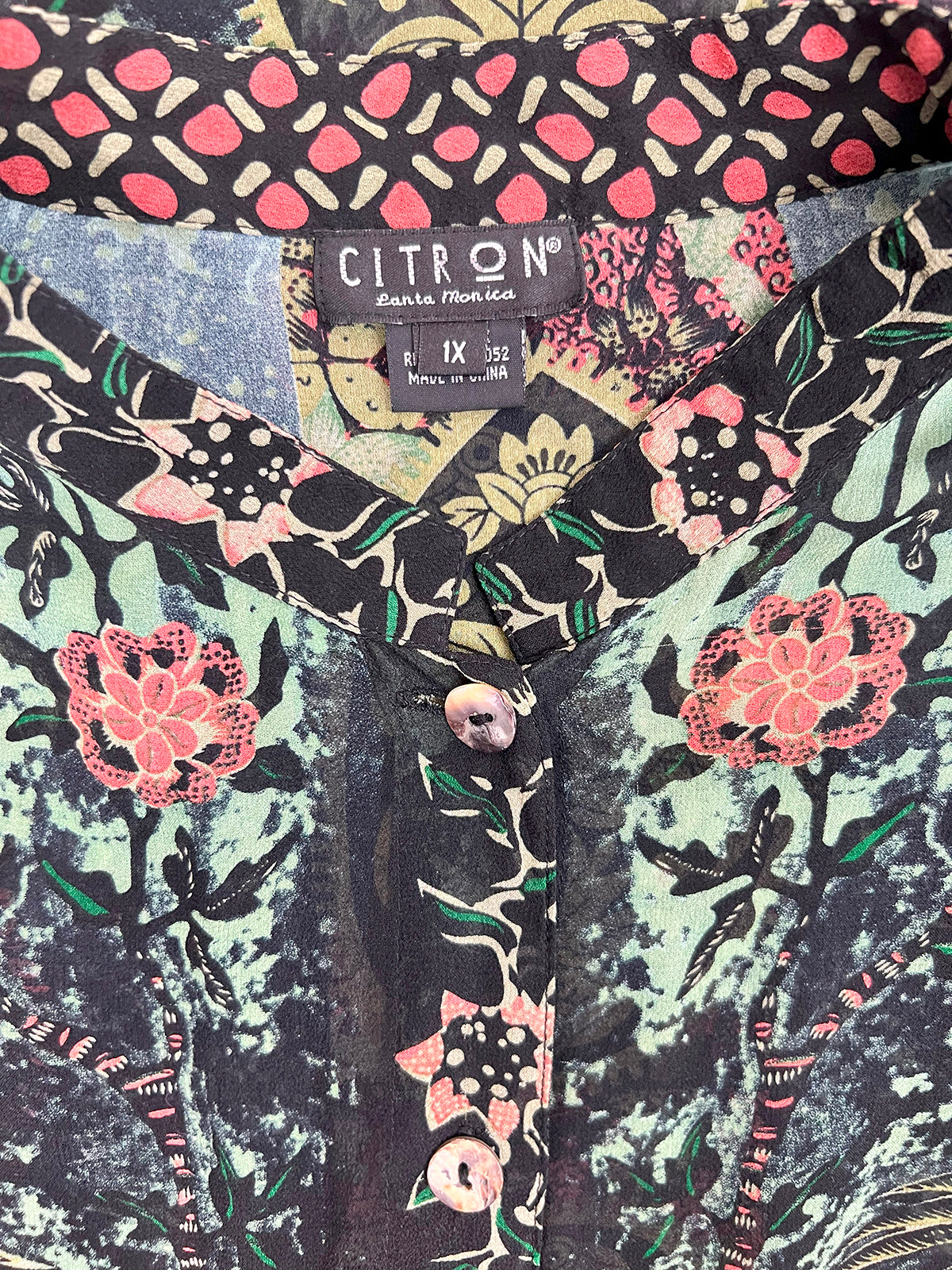 Citron Size 1X Black Multi Peacock Floral Silk Shirt