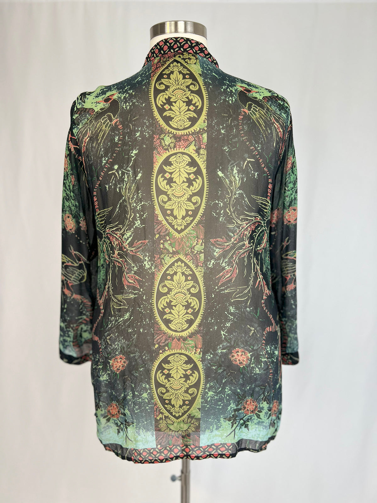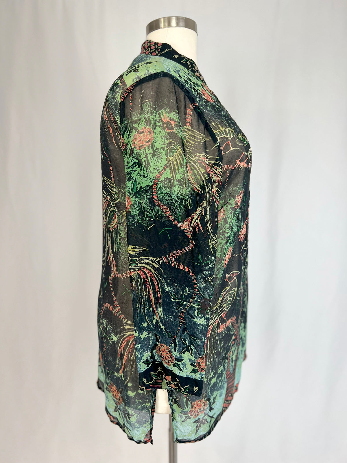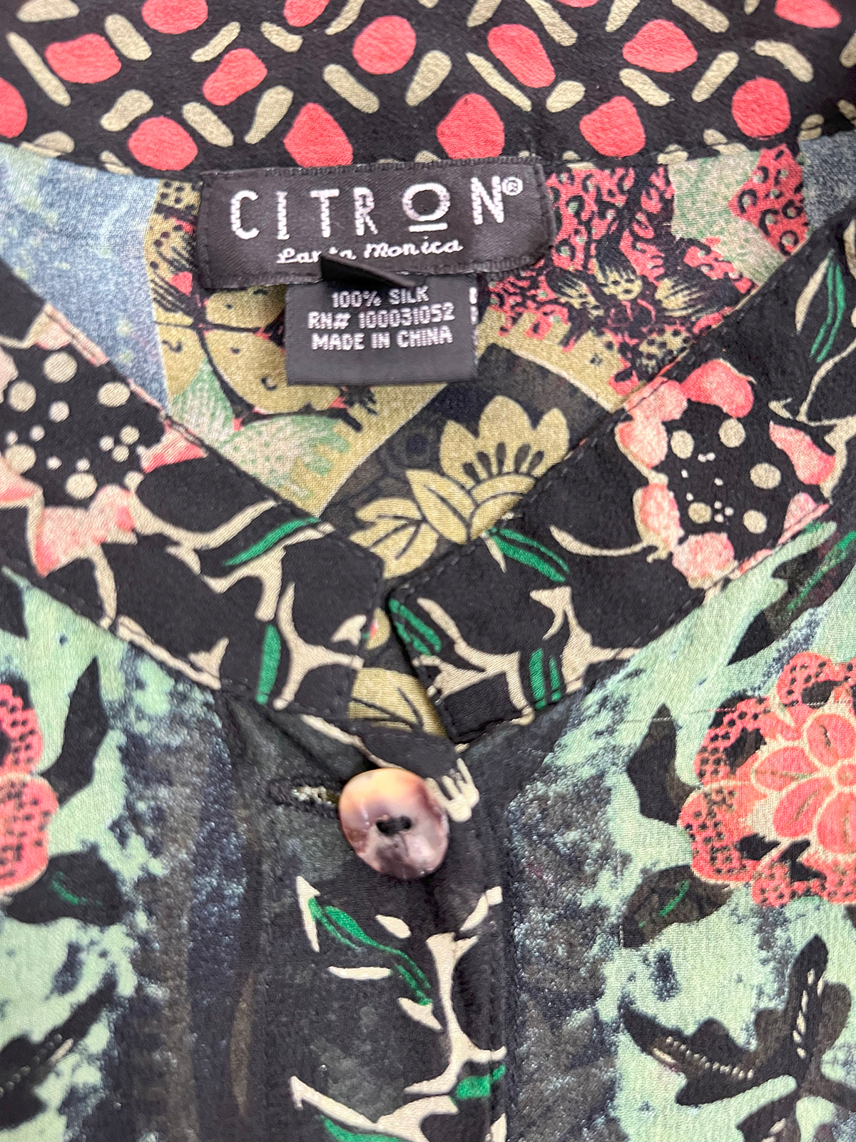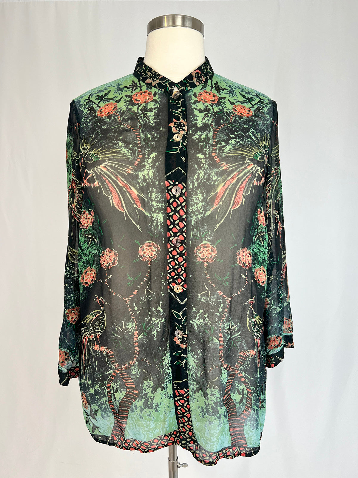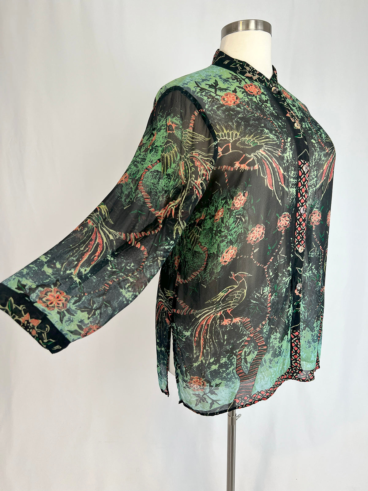Classic Citron Silk Blouse with peacock & floral black, teal & coral print. Long sleeves, mandarin collar, and shell buttons.