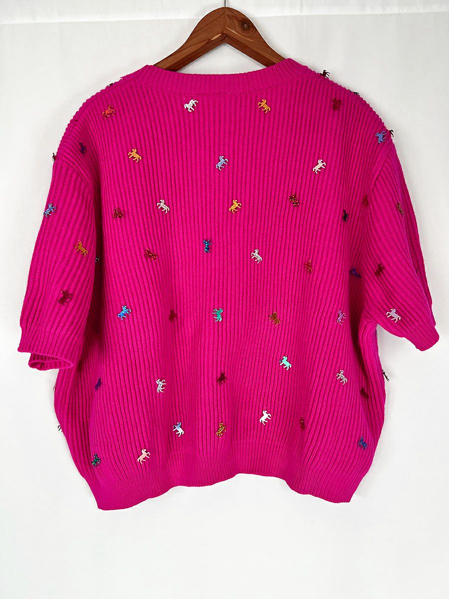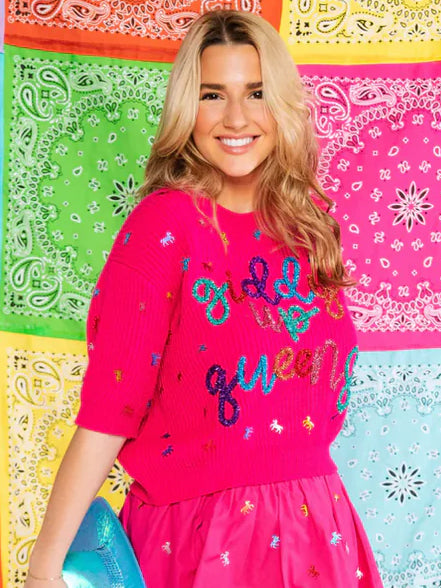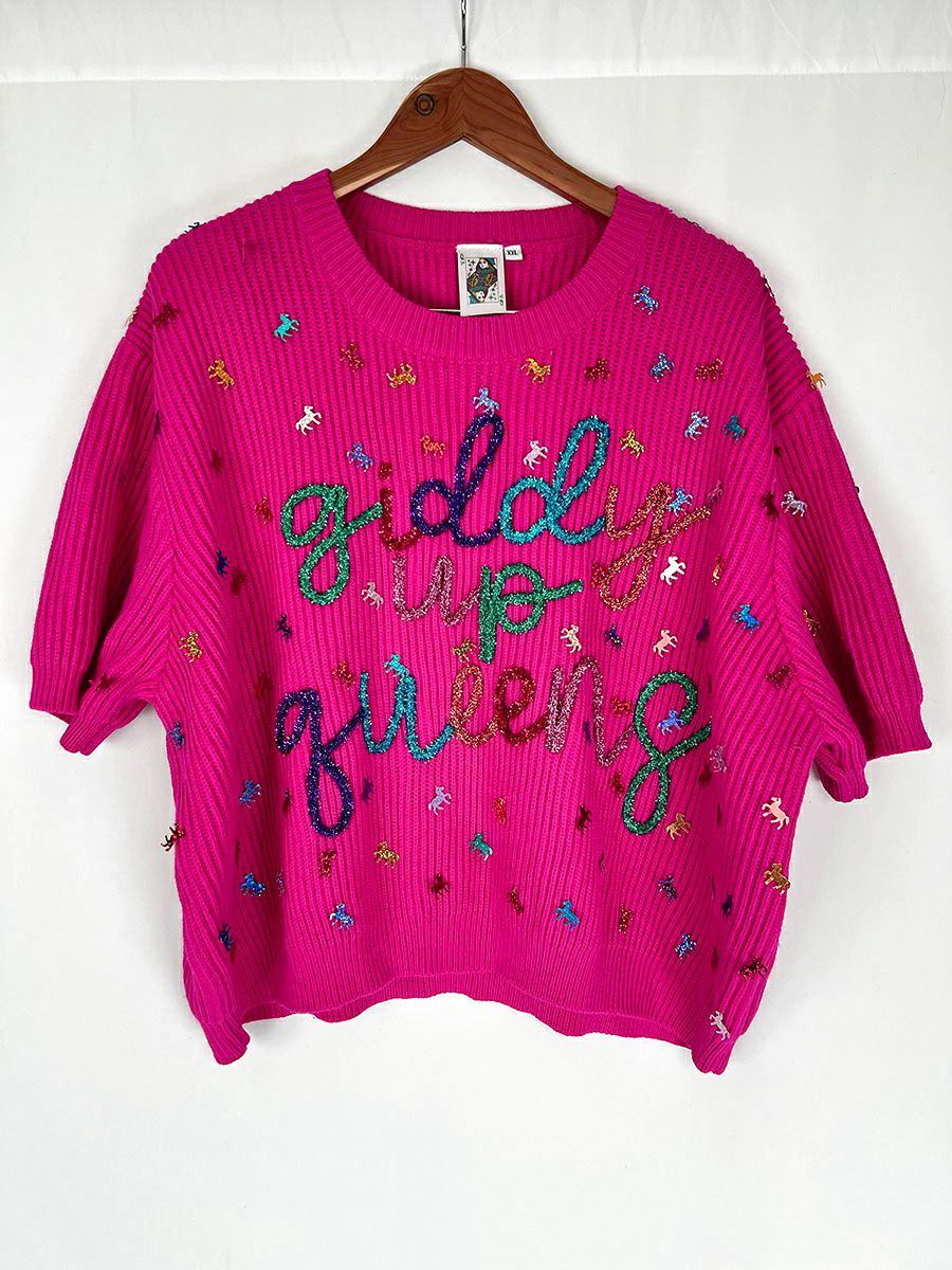 "Giddy Up Queens" glitter writing with horse paillettes throughout. Short-sleeve, cropped-length, heavy knit sweater.