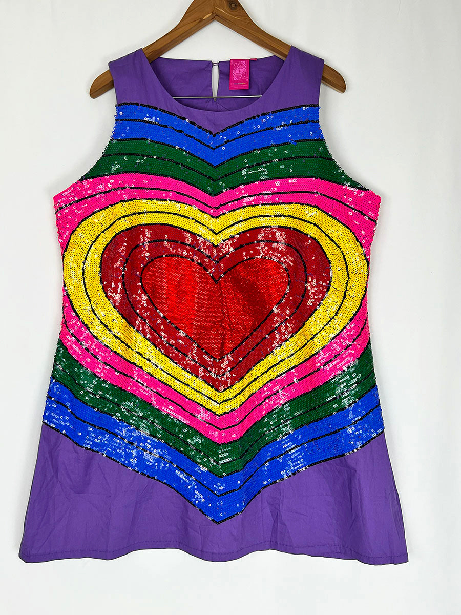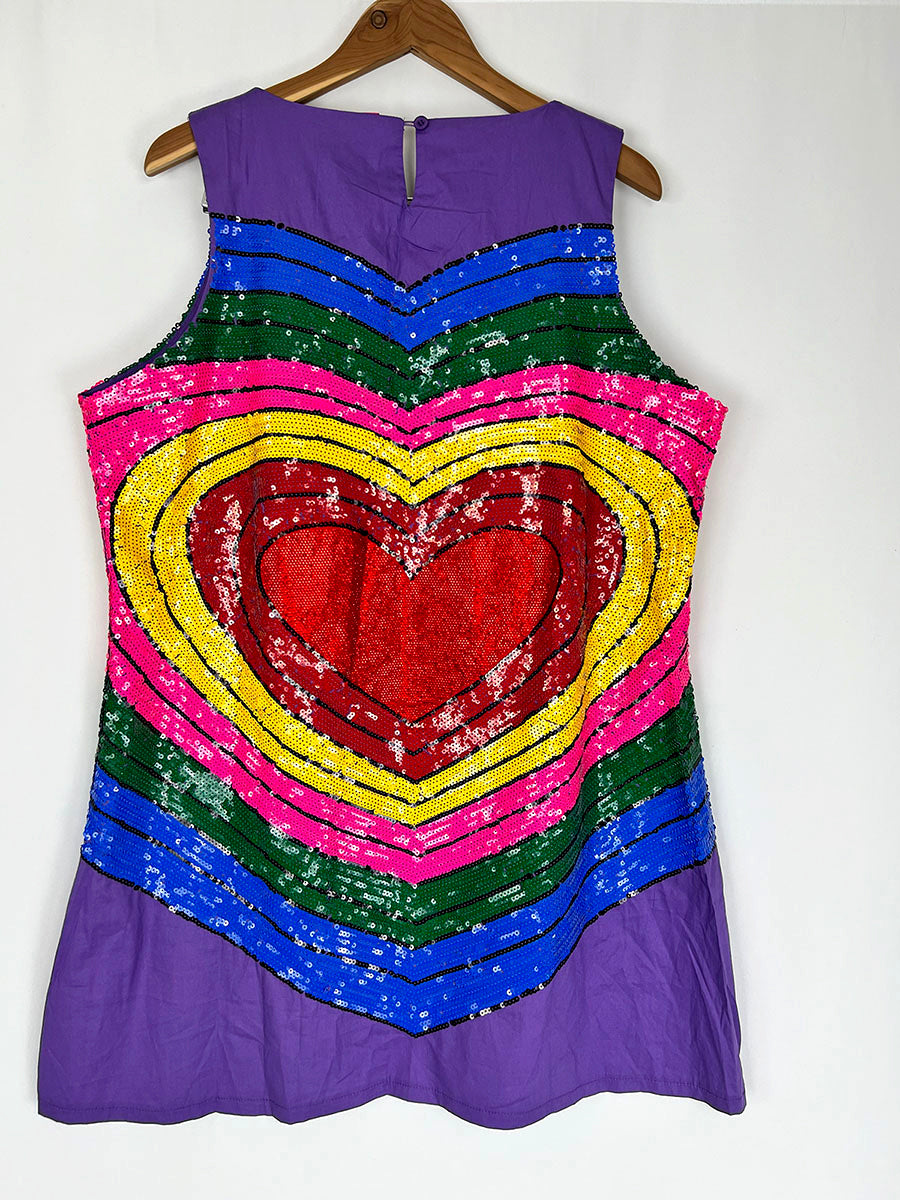Purple with red heart & rainbow stripes Sleeveless mini tank dress. Zip-up back w/ keyhole neck & button top-closure. Design on both front & back.