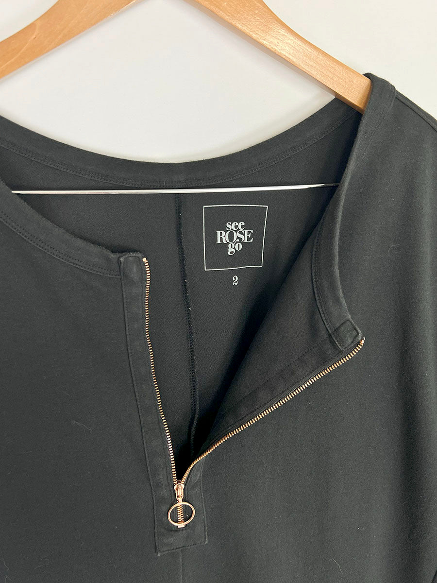Designed with a relaxed fit, 9 Inch zip at front neckline, On-seam hidden pocket with zip closure, Model is 5’10” wearing size 2. 55% Cotton 45% Polyesters