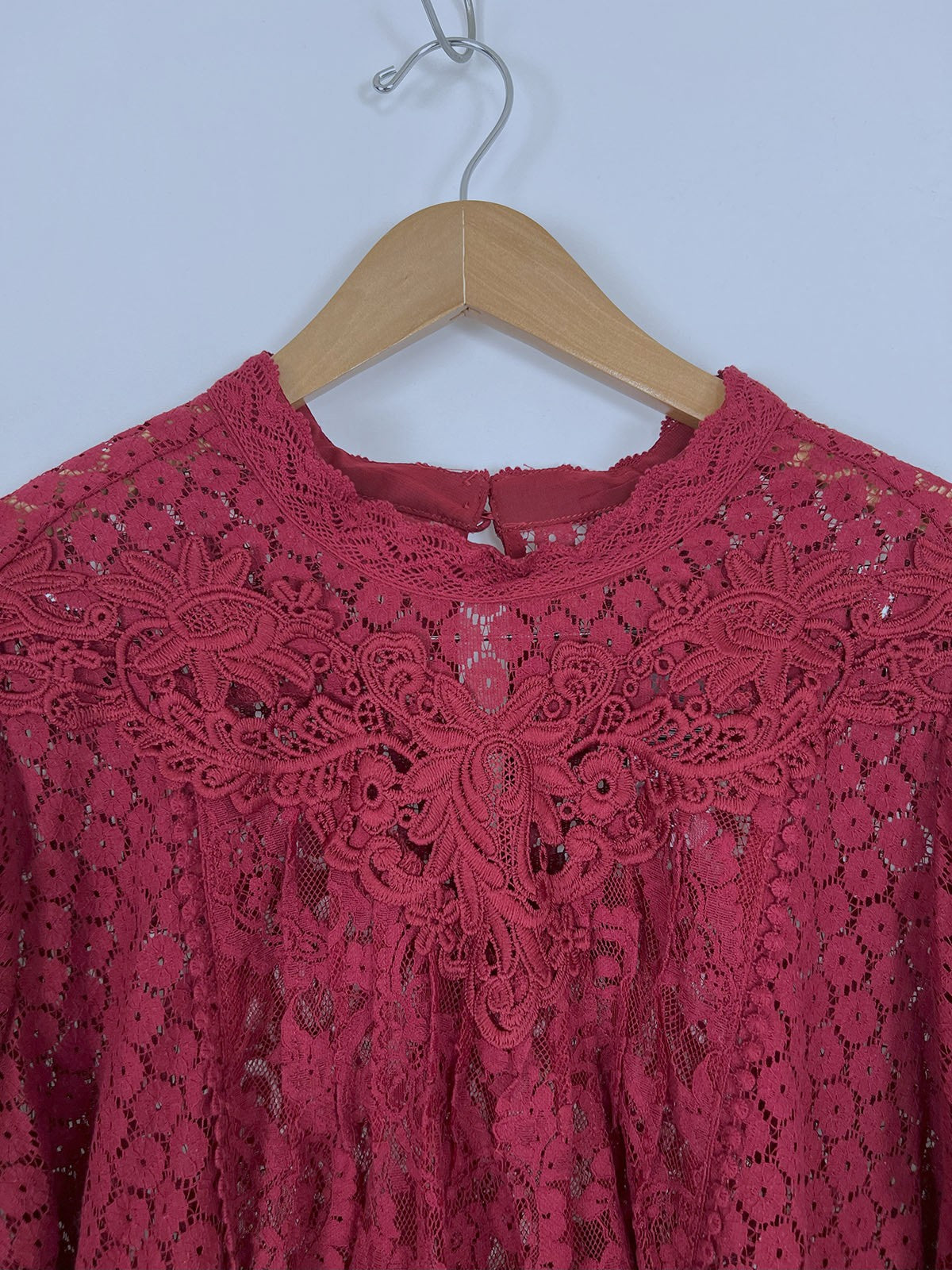 NWT - UNWORN - Original Tags - "Mixed Lace High Neck Top" - Burgundy Red. Cotton blend and lace knit fabric with slight stretch.