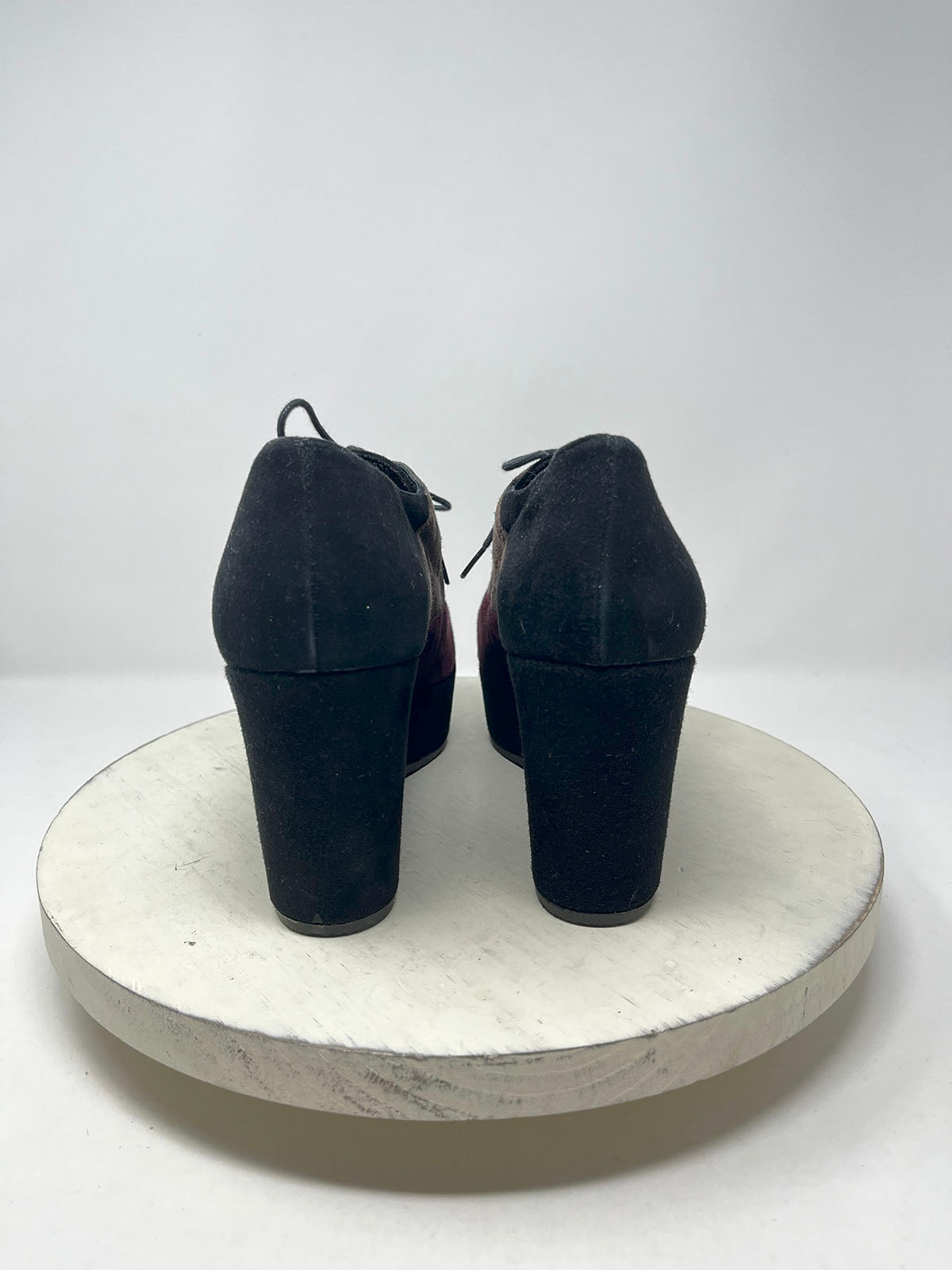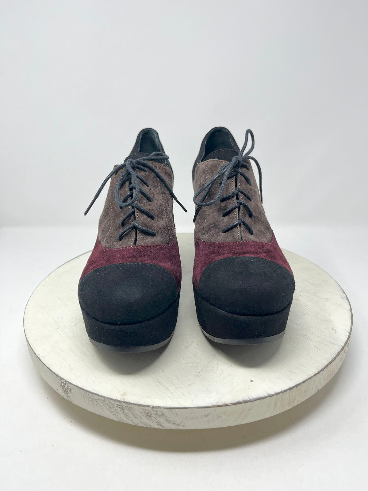 NWOB - UNWORN - Retro/vintage vibe, High wedge, platform shootie. Black, burgundy & taupe color-blocked patchwork suede leather & rubber sole. Elevate your shoe game with these stylish Melin Wedges Platform heels. Made in Italy, these lace-up shoes feature a round toe shape and a platform/heel height, making them perfect for any occasion, from casual outings to business meetings. The shoe's upper material is made of high-quality suede, while the lining is made of leather, ensuring maximum comfort. These colorful, bohemian-inspired shoes have a unique block pattern and a wedge heel style, adding a touch of sophistication to any outfit. With their elegant design and durable construction, these Melin Wedges Platform heels are a must-have for any fashion-forward woman's shoe collection.