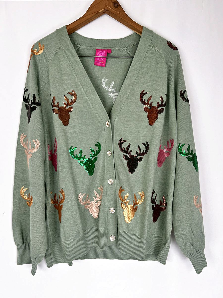 NIP - Original Packaging "Mint Sequined Deer Cardigan" button-front with sequined deer heads throughout.
