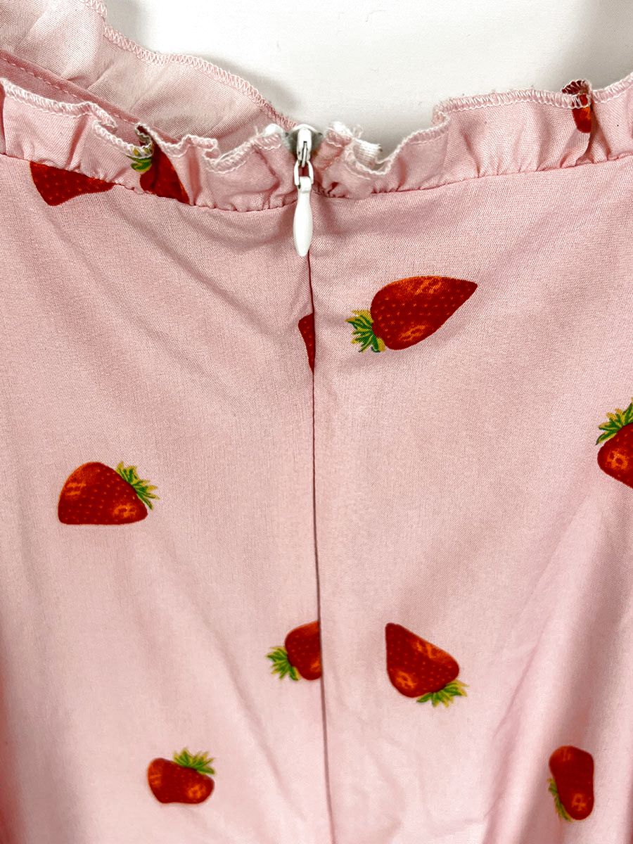 Cute in Strawberries! Mini sleeveless, ruffled trim with lace-up neckline. Zip-closure in back.