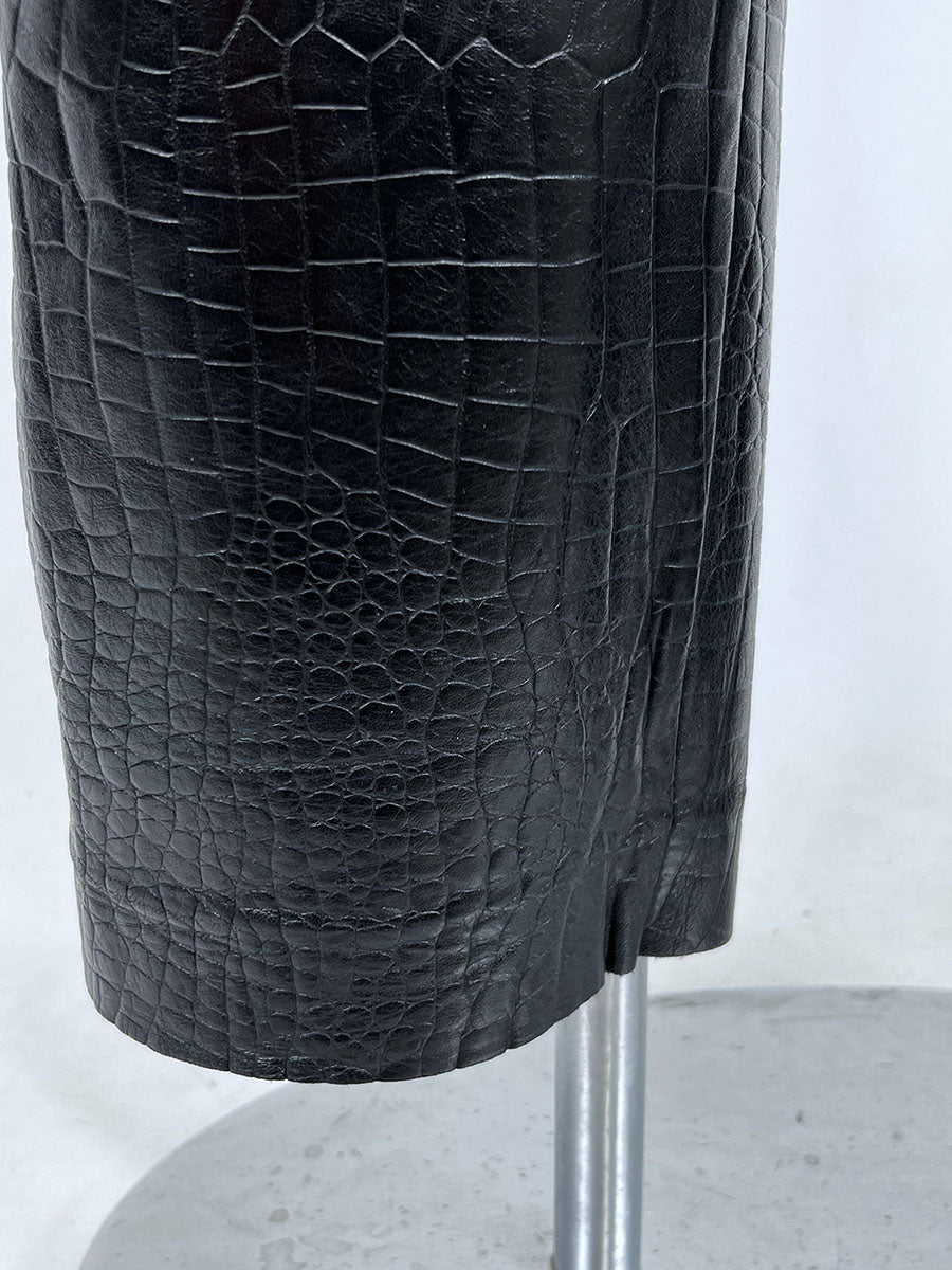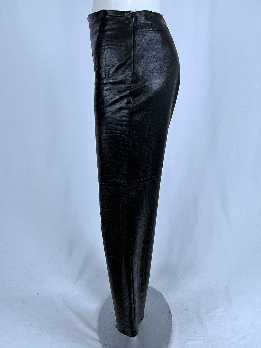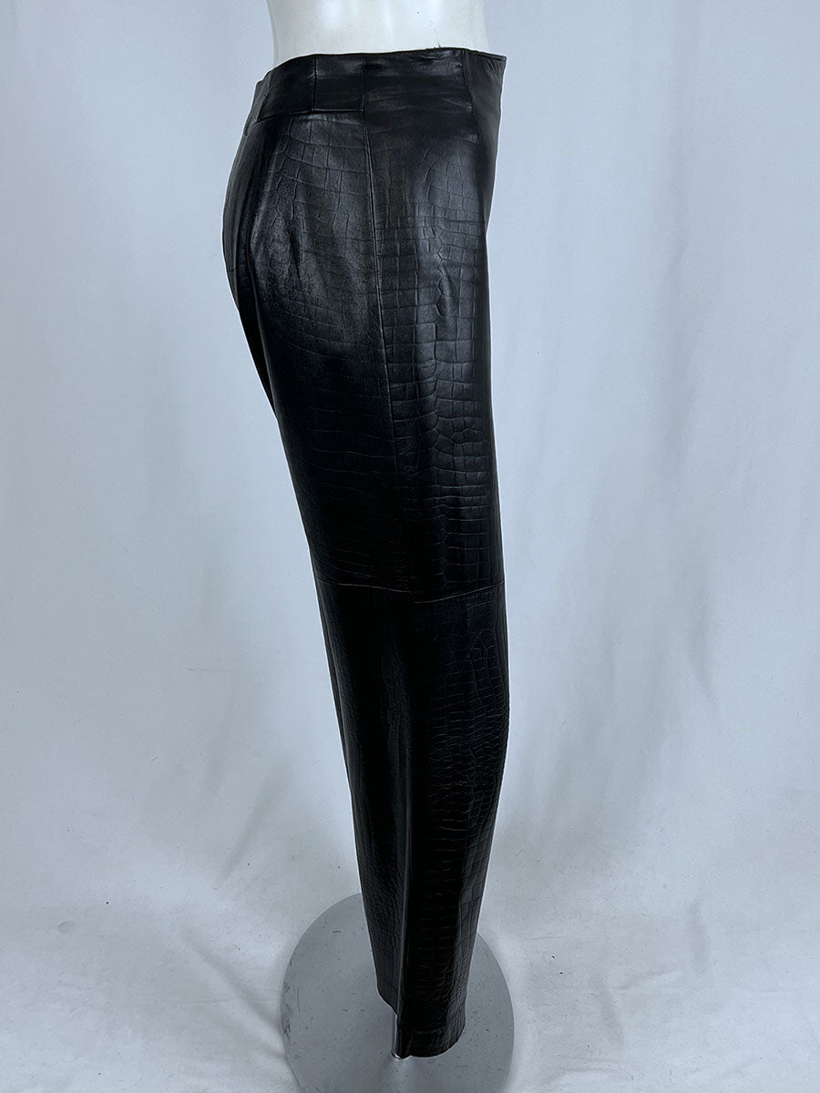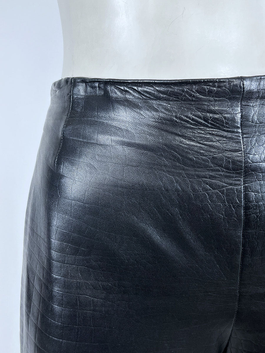 Vtg '80s - '90s black, buttery soft, subtle croc embossed pattern leather pants. Side zipper & button. Fully lined.