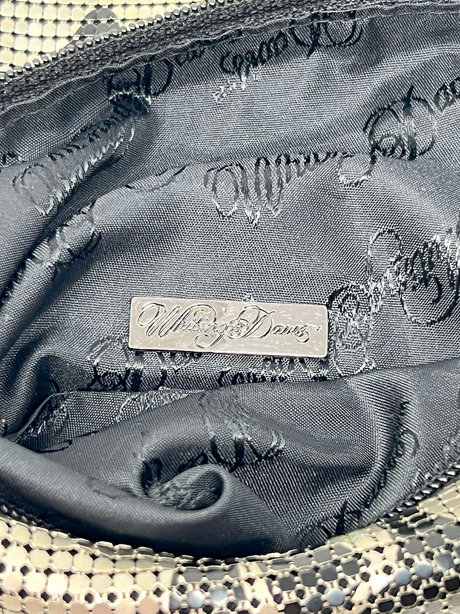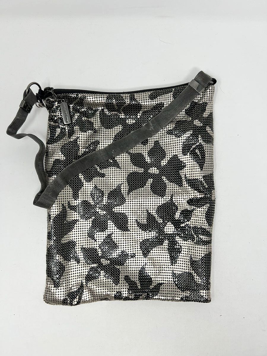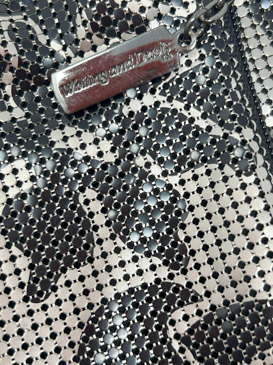 Classic Whiting & Davis metal mesh with floral design. Short, metal wire shoulder strap. Zip-top long rectangular purse.